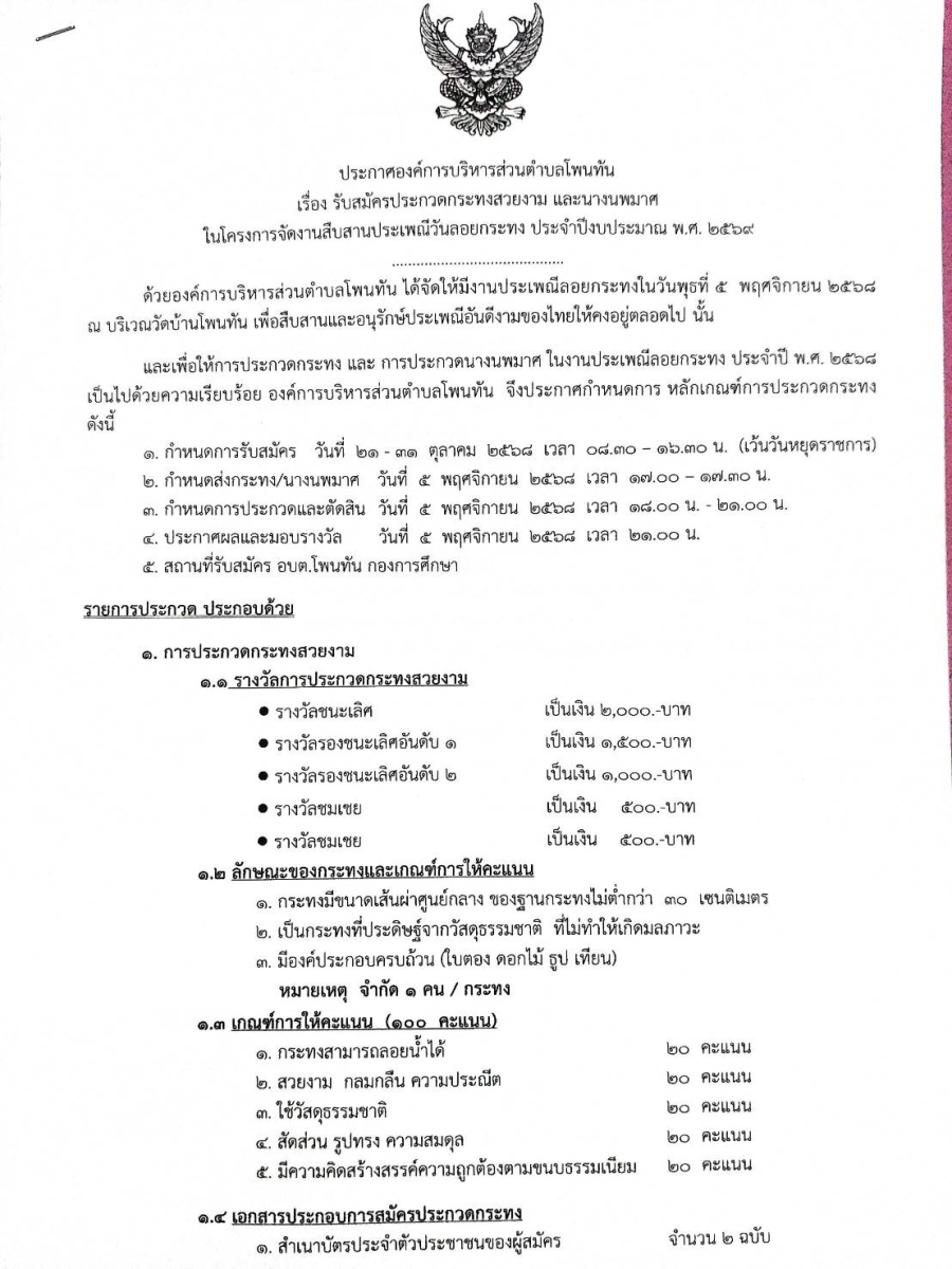 ประกาศรับสมัคร ประกวดกระทงสวยงาม ประจำปี 2568 ร่วมสืบสานประเพณีลอยกระทงสุดงดงาม ณ บริเวณวัดบ้านโพนทัน เงินรางวัลสำหรับกระทงสวยงาม 1. รางวัลชนะเลิศ ได้รับเงินรางวัล 2,000 บาท 2. รางวัลรองชนะเลิศ อันดับ 1 ได้รับเงินรางวัล 1,500 บาท 3. รางวัลรองชนะเลิศ อันดับ 2 ได้รับเงินรางวัล 1,000 บาท 3. รางวัลชมเชย จำนวน 2 รางวัลๆ ละ 500 บาท