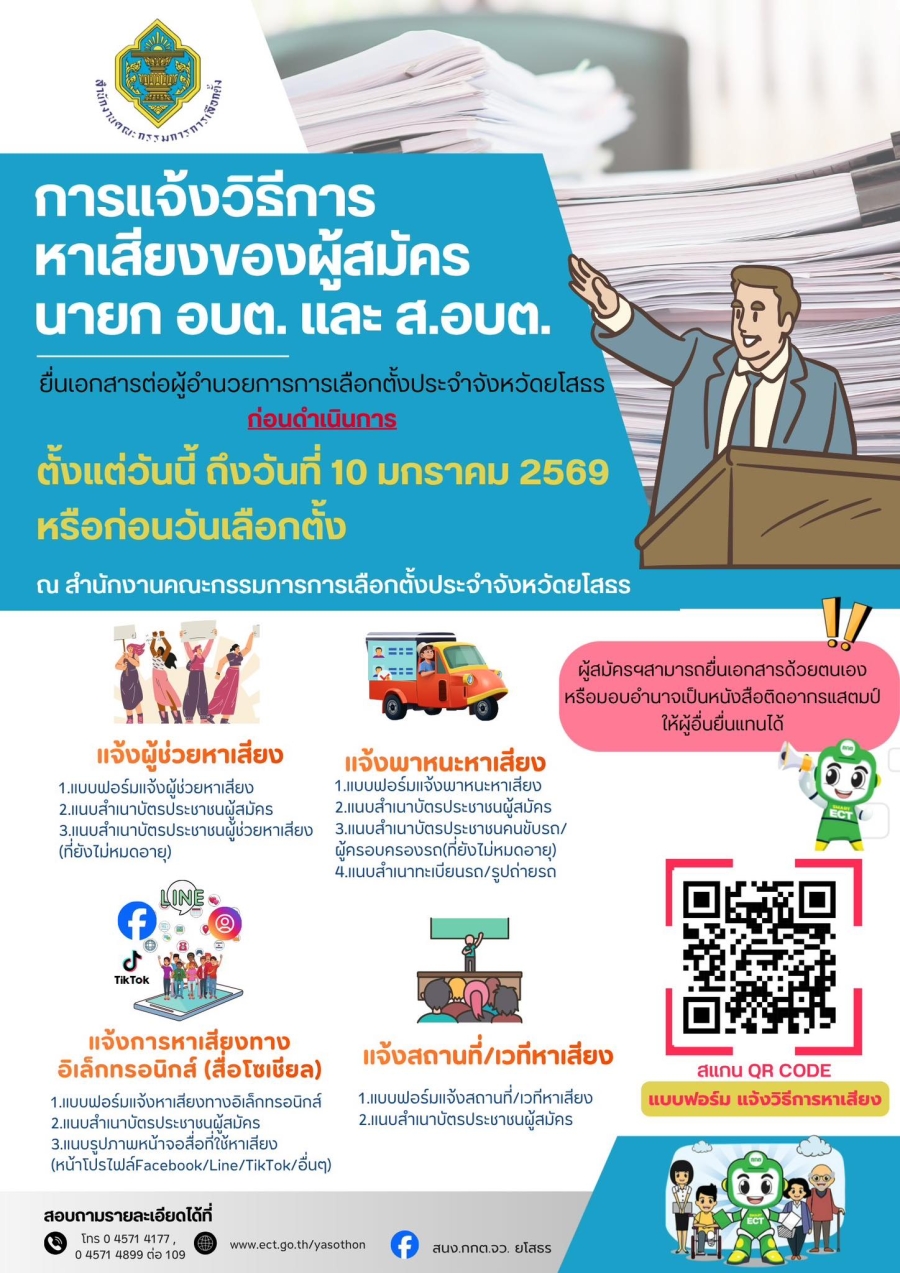 สนง.กกต.จว.ยโสธร ขอประชาสัมพันธ์การแจ้งวิธีการหาเสียงของผู้สมัคร นายก อบต. และ ส.อบต. โดยยื่นเอกสารต่อผู้อำนวยการการเลือกตั้งประจำจังหวัดยโสธร ก่อนดำเนินการ ตั้งแต่วันนี้ ถึงวันที่ 10 มกราคม 2569 หรือก่อนวันเลือกตั้ง ณ สำนักงานคณะกรรมการการเลือกตั้งประจำจังหวัดยโสธร