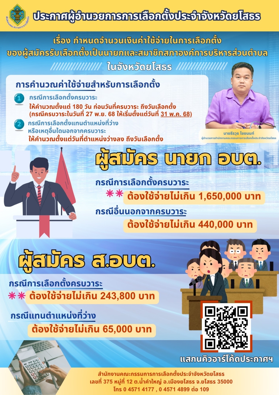 ประชาสัมพันธ์ประกาศผู้อำนวยการการเลือกตั้งประจำจังหวัดยโสธร เรื่อง กำหนดจำนวนเงินค่าใช้จ่ายในการเลือกตั้ง ของผู้สมัครรับเลือกตั้งเป็นนายกและสมาชิกสภาองค์การบริหารส่วนตำบล ในจังหวัดยโสธร