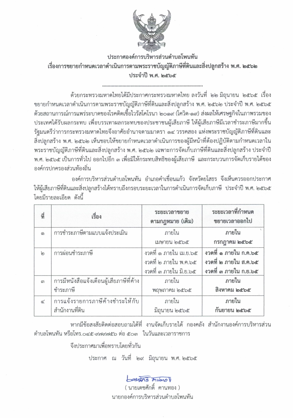 ประกาศการขยายกำหนดเวลาดำเนินการตามพระราชบัญญัติภาษีที่ดินและสิ่งปลูกสร้าง พ.ศ.2562 ประจำปี พ.ศ.2565 ประกาศ ณ.วันที่ 29 มิถุนายน พ.ศ.2565