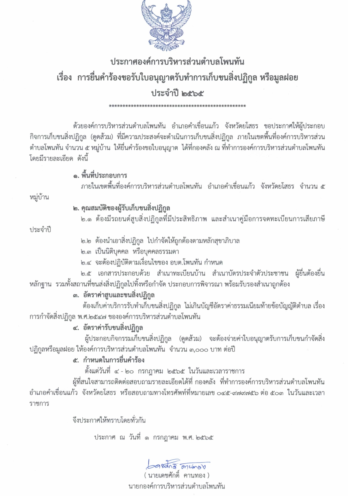 ประกาศ การยื่นคำร้องขอใบอนุณาตรับทำการเก็บขนส่งสิ่งปฎิกูล หรือมูลฝอย ประจำปี 2565 วันศุกร์, 01 กรกฎาคม 2565 14:21 Print Email การยื่นคำร้องขอใบอนุณาตรับทำการเก็บขนส่งสิ่งปฎิกูล หรือมูลฝอย ประจำปี 2565 ประกาศ ณ.วันที่ 1 กรกฎาคม พ.ศ.2565 ดาวน์โหลดเอกสาร (240 Downloads) back to top